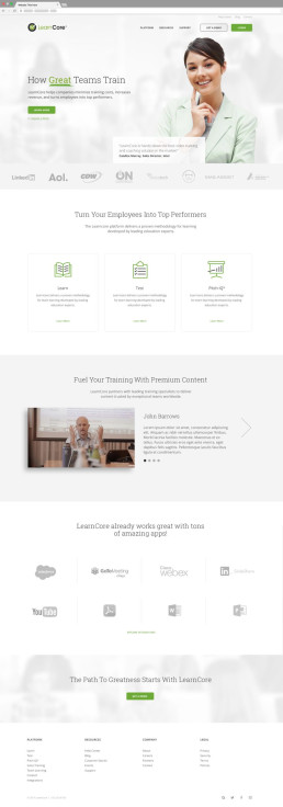 This is a mockup for the homepage for Learncore’s new website. This version introduces a significant amount of white space with clean visuals and custom iconography. This design also elegantly tells the brand’s story and raises brand equity to help the brand compete aesthetically with competitors. Note: The photo of the woman in the top header area is a stock photo, and is intended to be replaced with a real customer photo.
